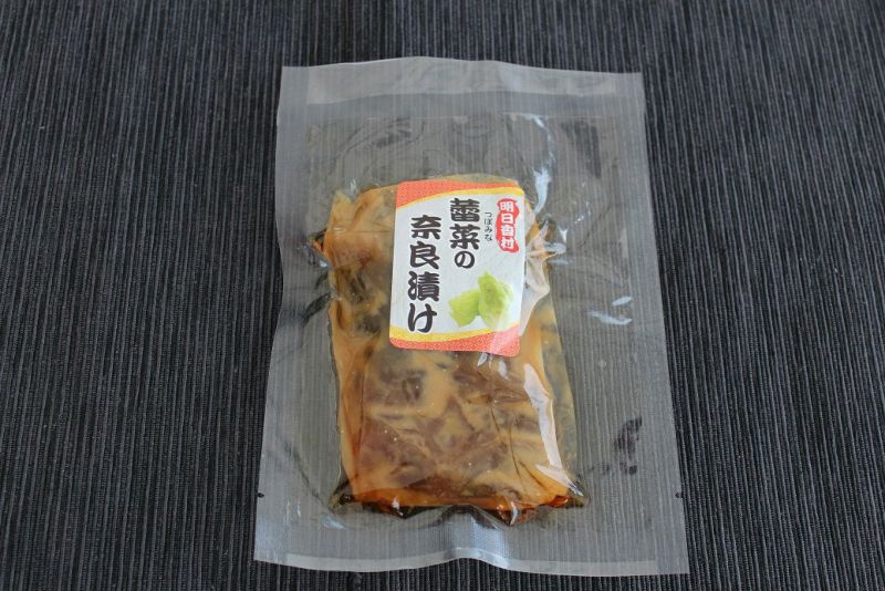 高菜の一種で子持ち高菜の新芽「つぼみ菜」を明日香村で栽培し、奈良漬けにしました。明日香村のオリジナル商品です。