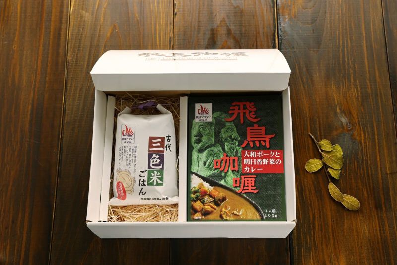 奈良県の特産豚「大和ポーク」と明日香村で採れた野菜で作ったカレーと明日香村育ちの古代米三種(黒米、赤米、緑米)に明日香村産ヒノヒカリを最良のバランスで配合した「古代米三色ごはん」のセットです。