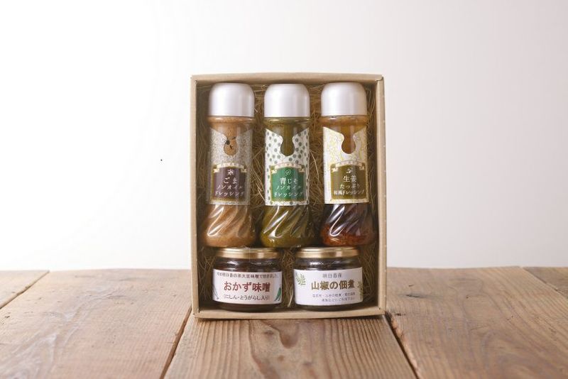 明日香のドレッシングと、山椒の佃煮、おかず味噌をギフトにしました。