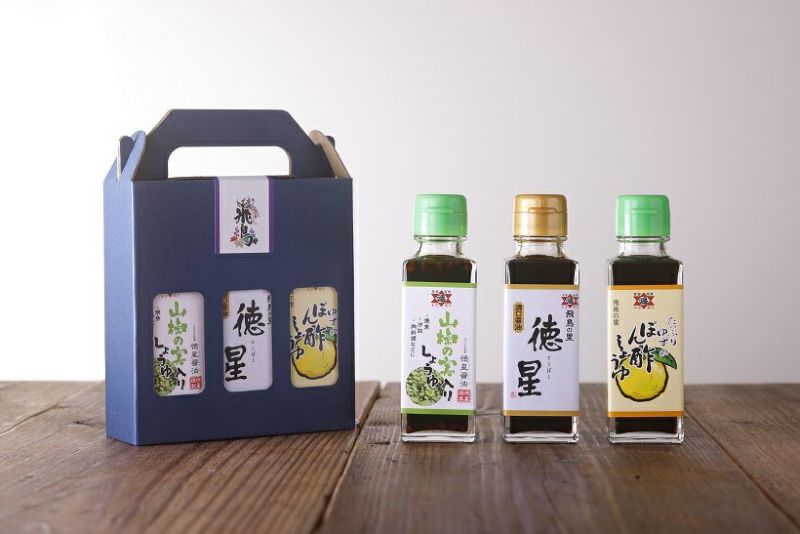 明日香村の老舗醤油屋の厳選の三本セット(山腹の実入り醤油、濃口醤油、ゆずぽん酢醤油)です。焼き魚や冷奴、肉料理にオススメです。