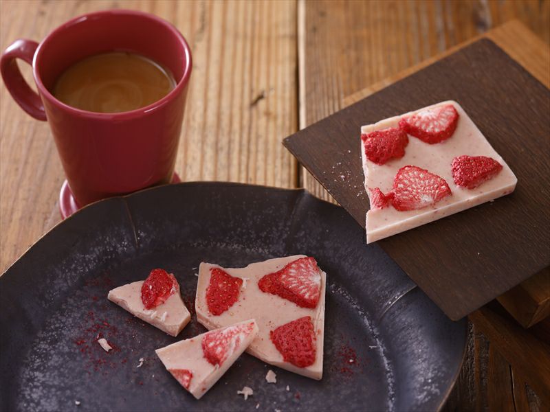 明日香村で採れたあすかルビーを贅沢に使ったホワイトチョコレート。フリーズドライ製法ならではの鮮やかな色合いと豊かな薫り。見た目も味も村自慢のあすかルビーが主役のチョコレートです。