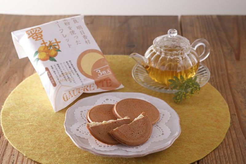 奈良県産温州みかんの果実を練り込んだバニラクリームがたっぷり。ゴーフレットの生地には明日香村産ヒノヒカリの米粉を加えてサクサクとした食感に焼き上げました。