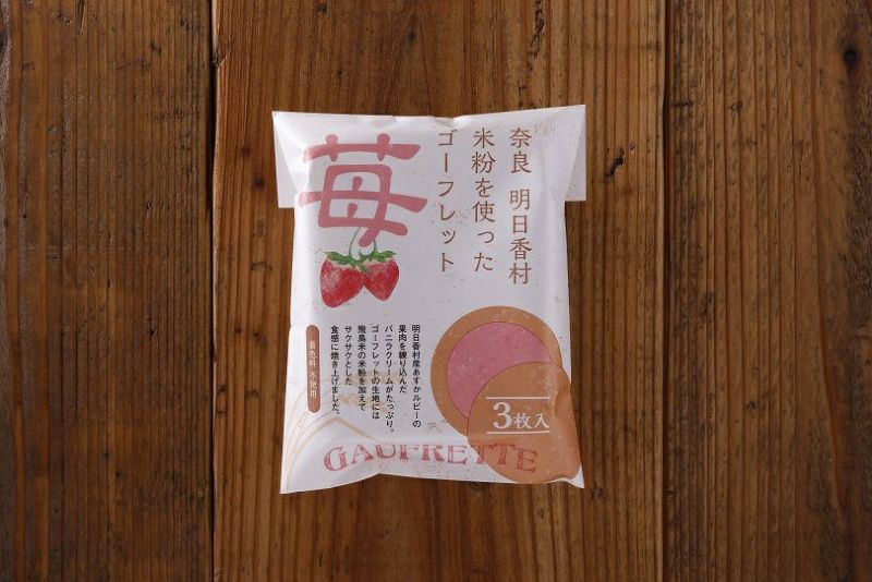 明日香のあすかルビーの果実を練り込んだバニラクリームがたっぷり。ゴーフレットの生地には明日香村産ヒノヒカリの米粉を加えてサクサクとした食感に焼き上げました。