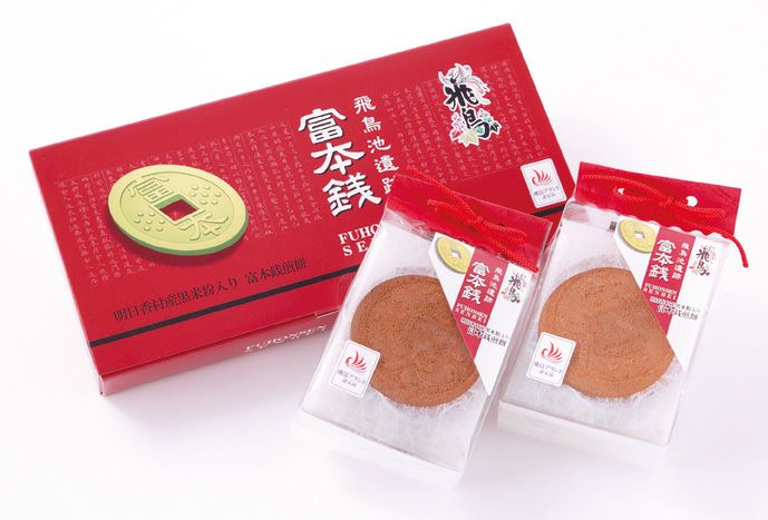 日本最古の貨幣と云われる富本銭をかたどった煎餅。明日香の米粉や黒米粉を使用し、コクのある味が特長です。